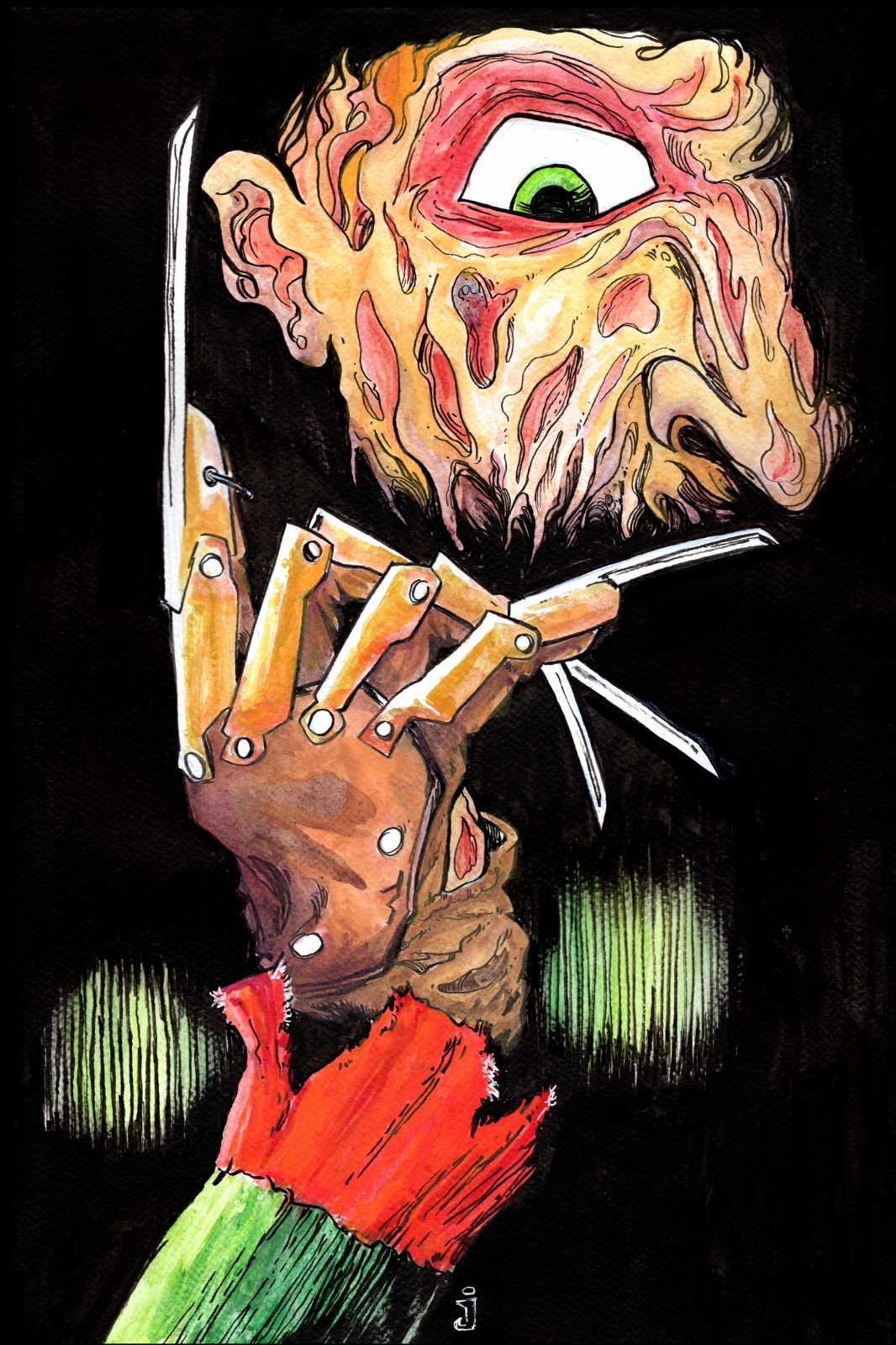 The L Jamal Walton Horror Movie Poster series continues with Freddy Krueger from Nightmare on Elm Street. This original is 12"x18" with the art covering the entire sheet. This is a multimedia illustration that includes inks and water color on 98lb (160 g/m2) mixed media paper.