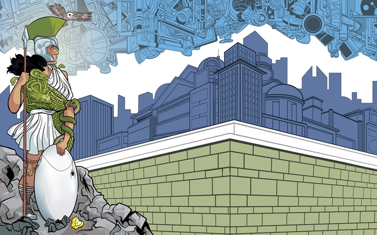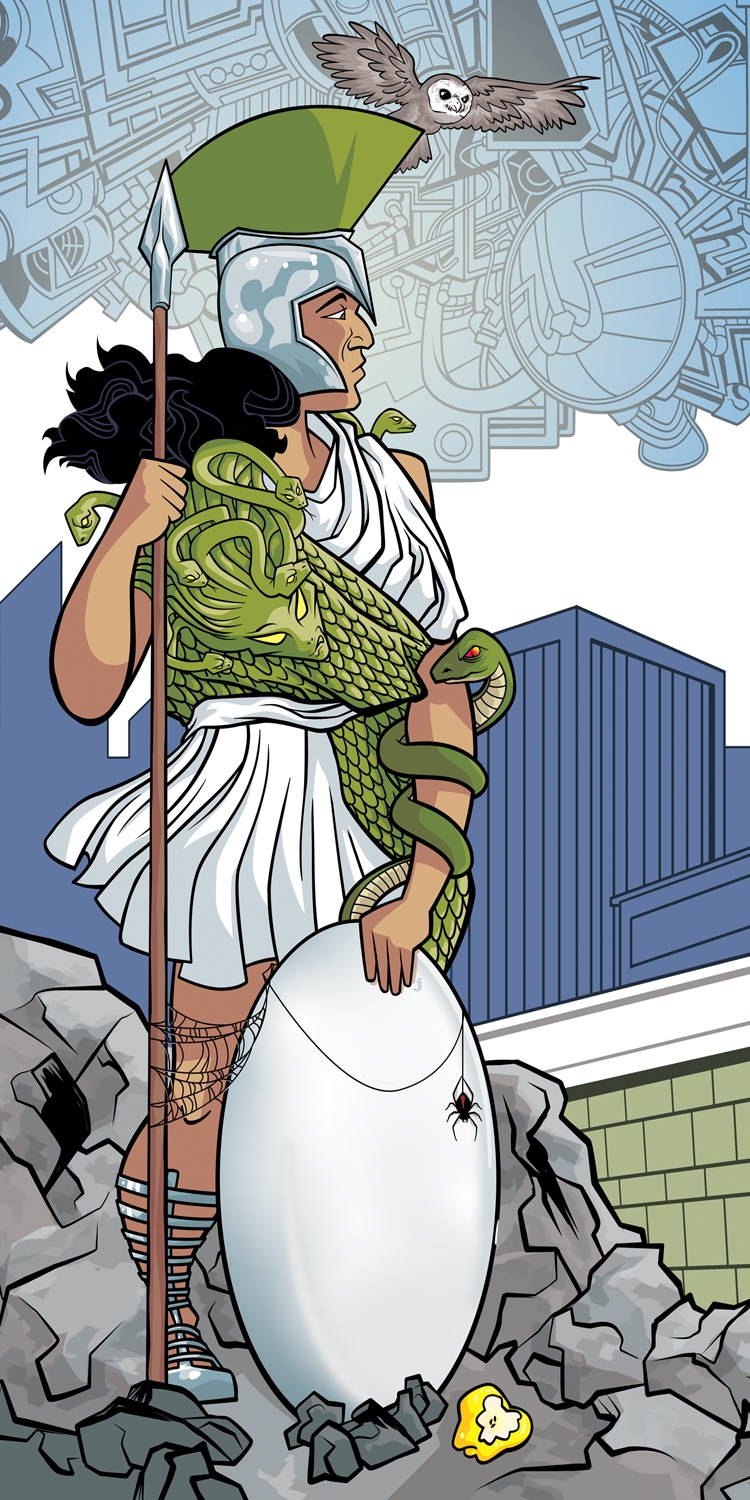 According to history, the Town leaders chose her to symbolize Chapel Hill as she represents civilization, knowledge, reasoning, logic, and wisdom. For this project, Athena is illustrated in a comic book style sharing her stories while watching over the “Southern Part of Heaven” that embraces the shape and colors of the Chapel Hill flag.