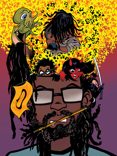 A creator with his creations pouring out  of his head. This image is featured as the cover of Welcome to My Madness.