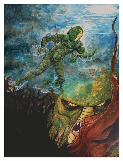 The L Jamal Walton Horror Movie Poster series continues with entry #2, Gill-Man AKA the Creature from the Black Lagoon. This original is 18"x24" with the art covering 17"x23". This is a multimedia illustration that includes Bombay India inks, colored pencils, and gouache on 140lb (300 g/m2) cold press watercolor paper.