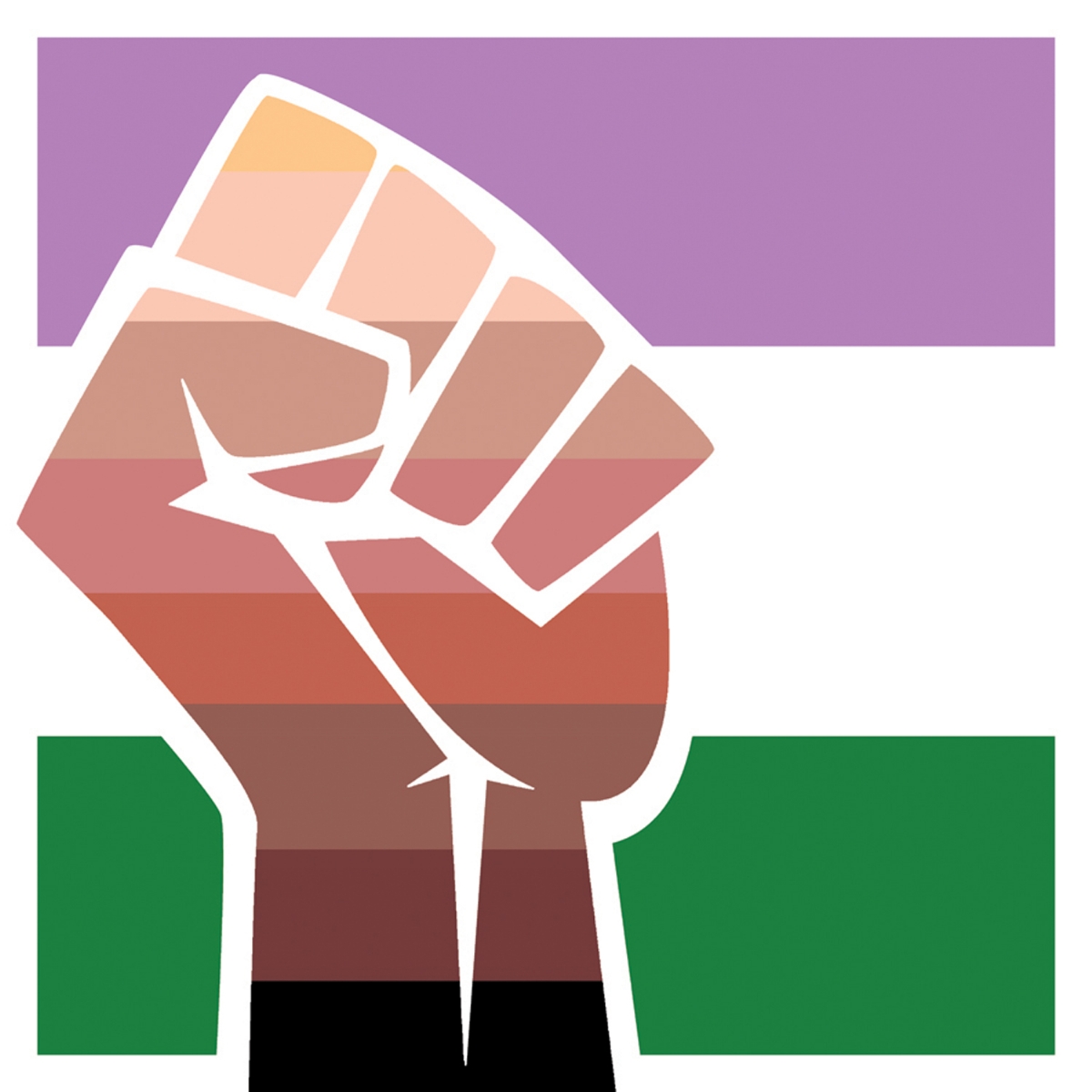 This 3" square sticker features multi-cultural unity fist in front of the Genderqueer flag.